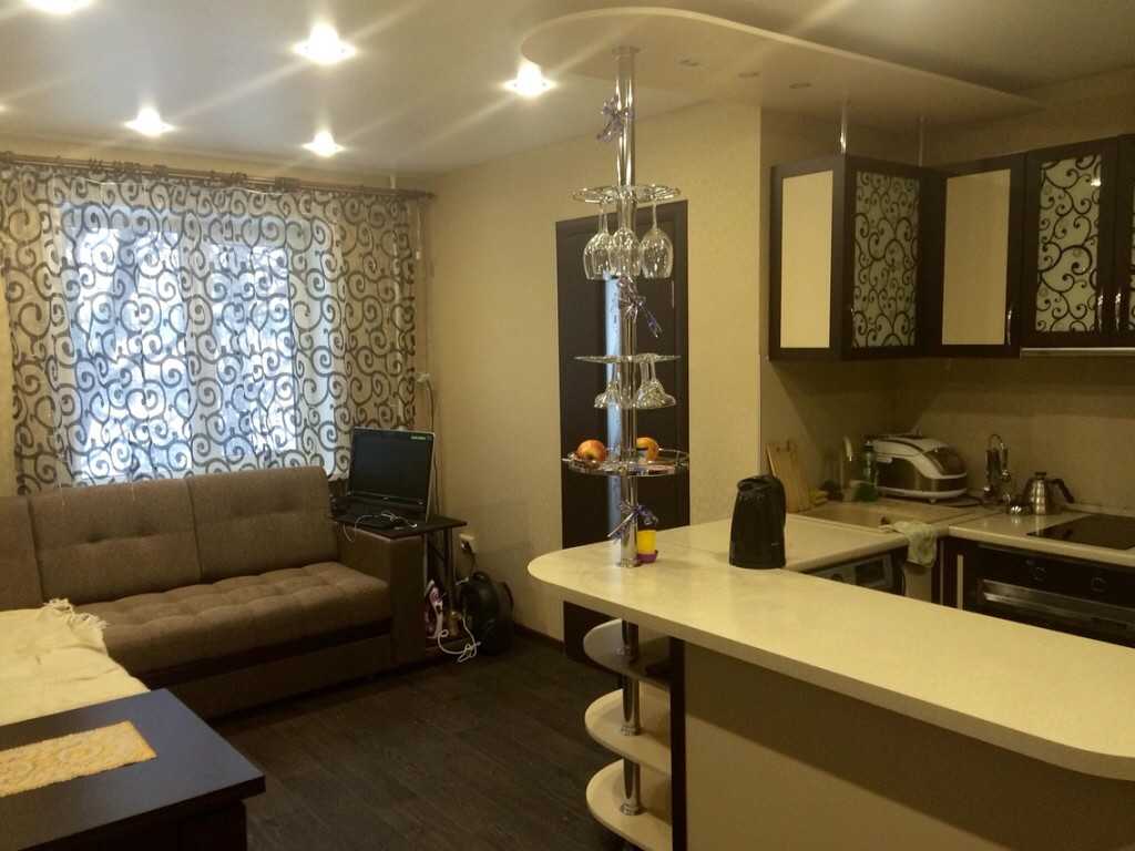 Такое помещение можно зонировать, используя для этого двухуровневый пол или потолок, раздвижные двери, барную стойку, специальное освещение, аквариум или живые растения, арку, покраску стен в разные цвета, деревянные перегородки и раздвижные конструкции.