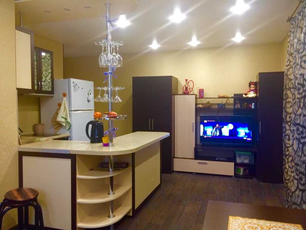 Барная стойка — более распространенное решение, заключающееся в разделении двух частей посредством той же барной стойки. Такой вариант вполне неплох, ведь эта перегородка активно используется для переноса пищи, а также для дружеских посиделок. К тому же визуально она отлично дополняет многие стили.