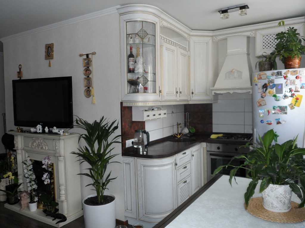 Небольшую панель на кухне в 8 кв. встраивают в гарнитур. Оригинально смотрится техника, спрятанная за дверцами в шкафу или на фасаде мебели. Удобно расположить ТВ на одной из стен или в специально оборудованной нише. Плоский экран вставляют в рамку картины или подвешивают под потолком.