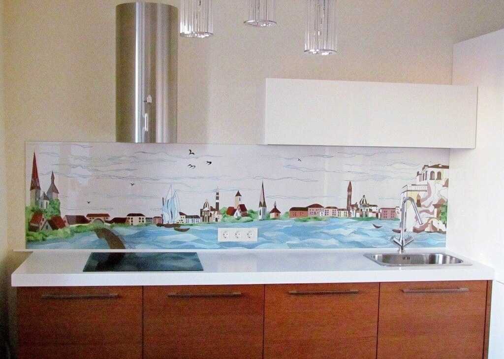 Дизайн кухни 16 кв. м со стеклянным фартуком поражает своей красотой. Вы можете дать волю фантазии и нанести на стекло живописные рисунки в любой технике, но это совсем не обязательно.