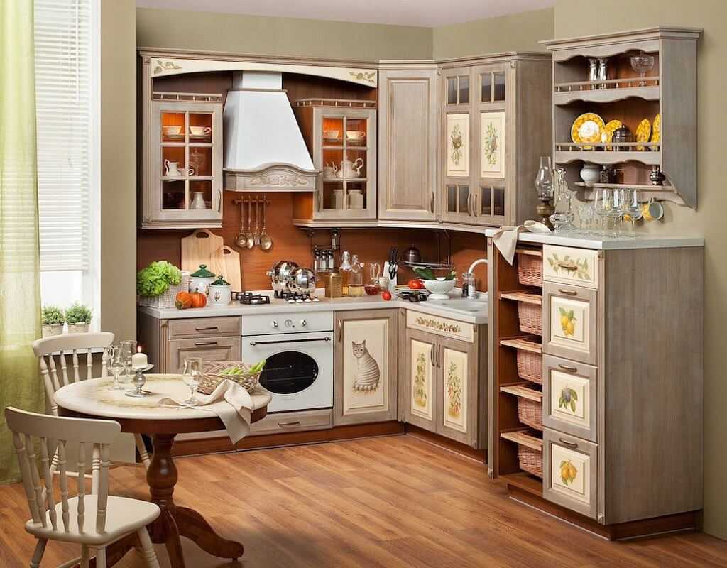 Отличным признаком креативного мышления и творческого потенциала является декорированный гарнитур и другие предметы мебели в технике декупаж или патина. Посуда, разделочные доски, баночки с крупами, прихватки точно также могут стать предметами декора. Не стоит прятать кухонную утварь в шкафы, лучше красиво расположить ее на рабочей поверхности или повесить на стену.