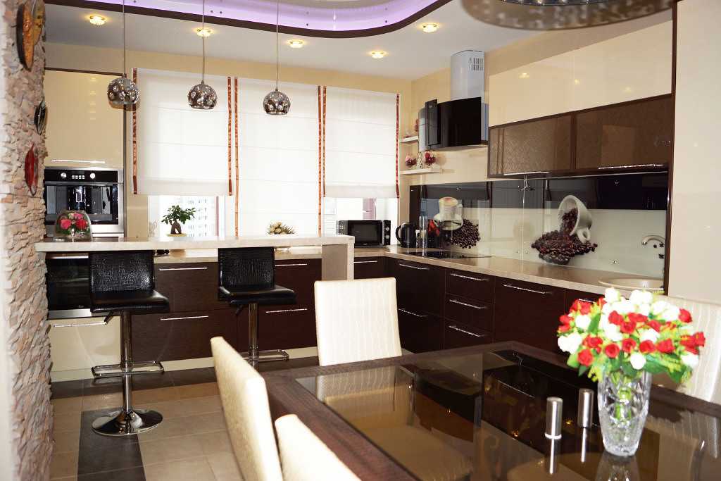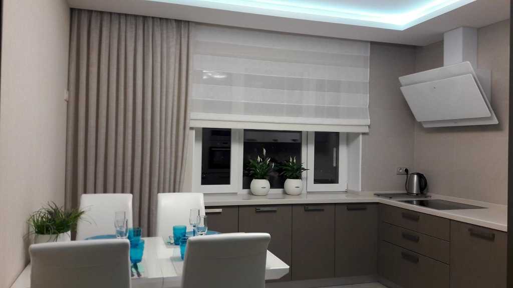 В этом году актуально сочетание длинных тканевых штор с технологичными роликовыми или римскими шторами. Это особенно хорошо смотрится в просторных кухнях, в которых присутствует и столовая зона.