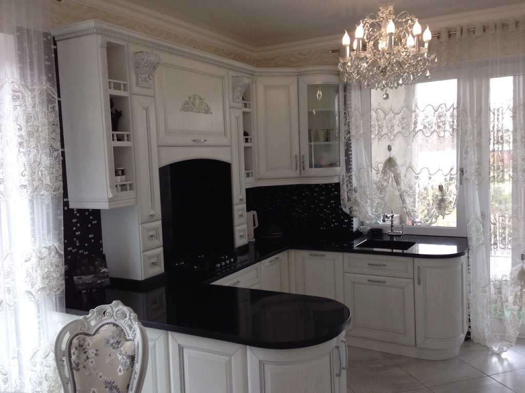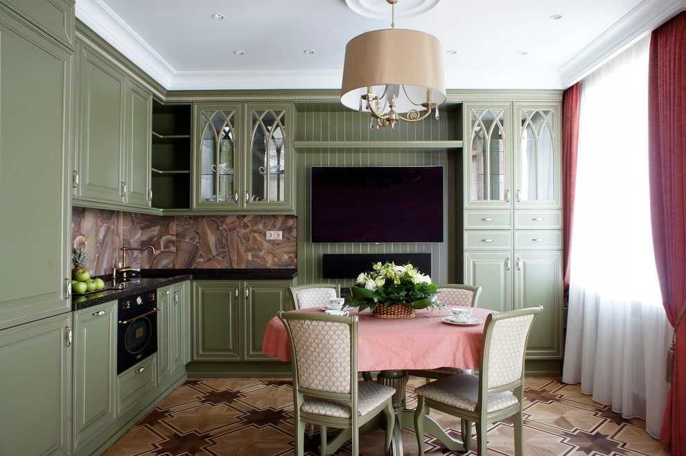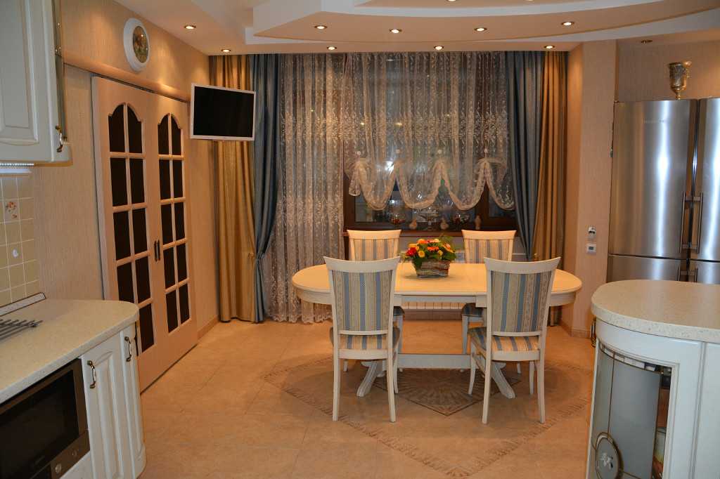 Для уже сложившего интерьера с декоративными излишествами можно подобрать тонкие простые занавески с элегантными драпировками из тюля или органзы. Чтобы сделать декор более выразительным, можно его дополнить ламбрекенами и подхватами. Ламбрекены, кстати, на классической кухне могут быть сколько угодно сложными — они не мешают функциональности кухни, а помещение приобретет роскошный, соответствующий выбранному стилю вид.