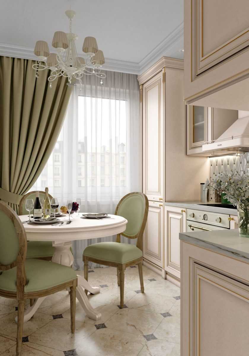 Классический стиль ассоциируется обычно со сложными многослойными конструкциями, однако допустимы такие излишества в спальне или в гостиной, но не на кухне. В небольшой кухне лучше использовать изящные короткие шторки, которые вполне отвечают требованиям современной классики, но смотрятся намного легче.