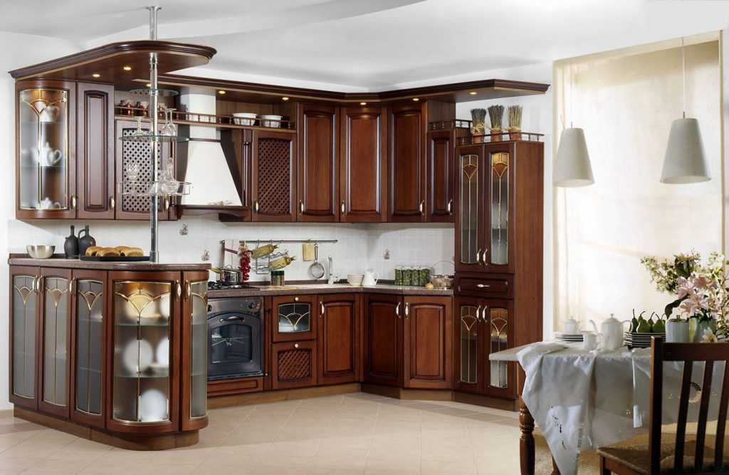 Дуб, вяз, ясень, орех, экзотические породы идут на изготовление таких фасадов. В результате получается престижный, благородный и дорогой дизайн кухни. Для ценителей традиций деревянный угловой гарнитур с элементами классики будет по вкусу.