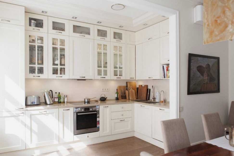 - 3 Большое значение играет форма помещения. Так, например, для узкой и вытянутой кухни угловая комплектация мебели — неразумный выбор. В этом случае лучше отдать предпочтение линейному расположению шкафов вдоль одной стены.