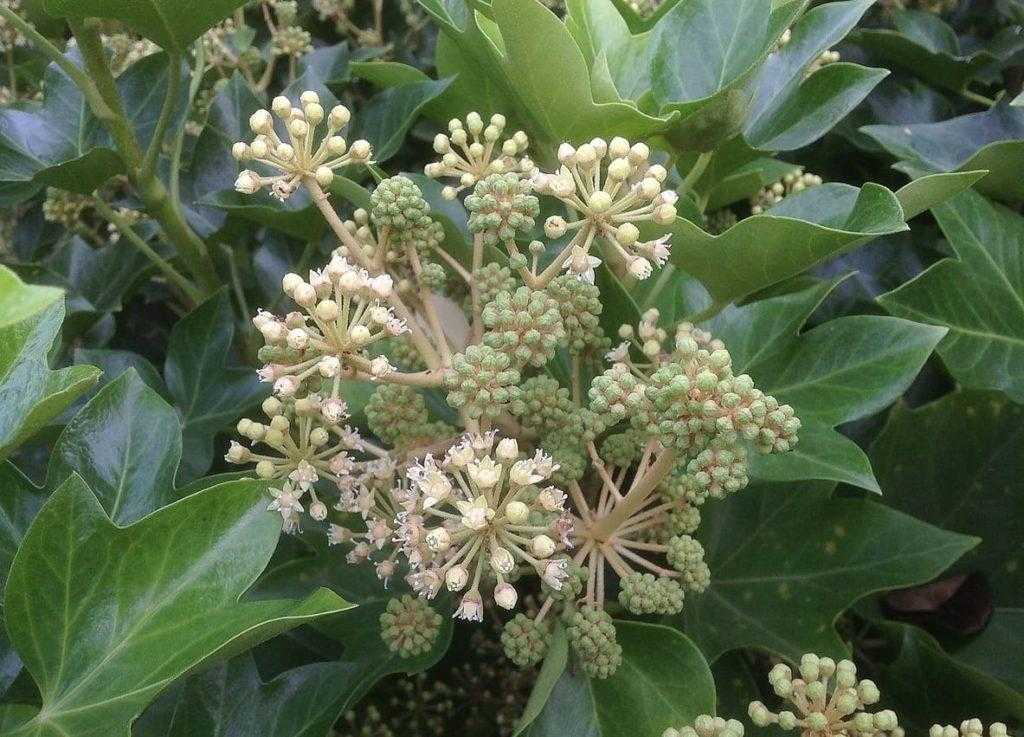 В конце августа — начале сентября на кустиках возникают соцветия в виде зонтиков с бутонами желто-зеленого или кремового оттенка. Если плоды появляются, то они выглядят в виде фиолетовых или синих ягод с несколькими семенами.