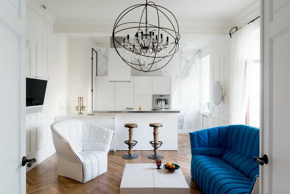 - Увеличение помещения. Соединив две комнаты разного назначения — кухню и гостиную — хозяева делают полезную площадь больше за счет удаления части межкомнатных стен. Правильное зонирование, а также использование световых и цветовых акцентов позволит усилить эффект увеличения пространства.