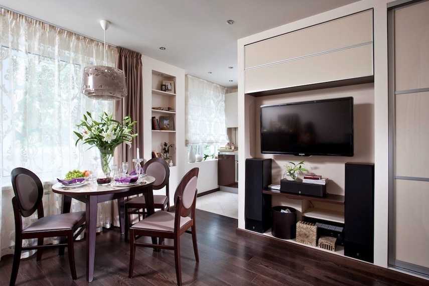 Кухня совмещенная с гостиной в хрущевке имеет свои положительные и отрицательные стороны. К достоинствам такой организации пространства можно отнести: