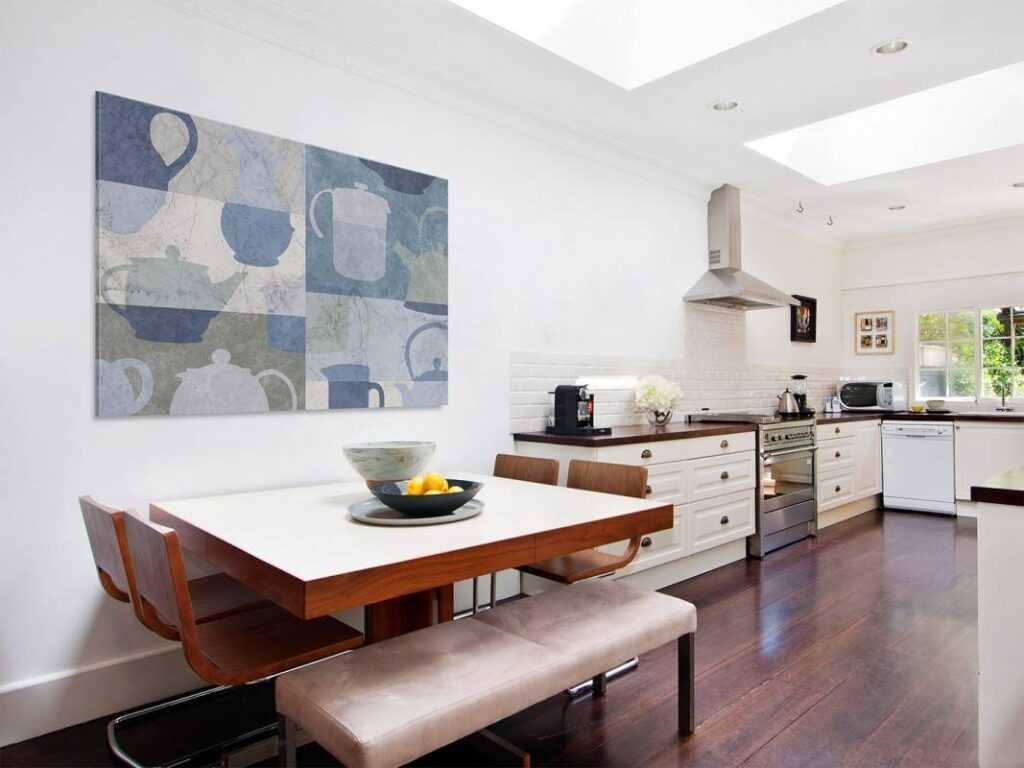 Кухня с отдельной обеденной зоной – это место, где собирается больше влаги, чем в гостиной или спальне. Если вам нравится готовить, на стенах также накапливается жир, который очень трудно очистить. Именно поэтому картины для кухни могут быть повреждены.