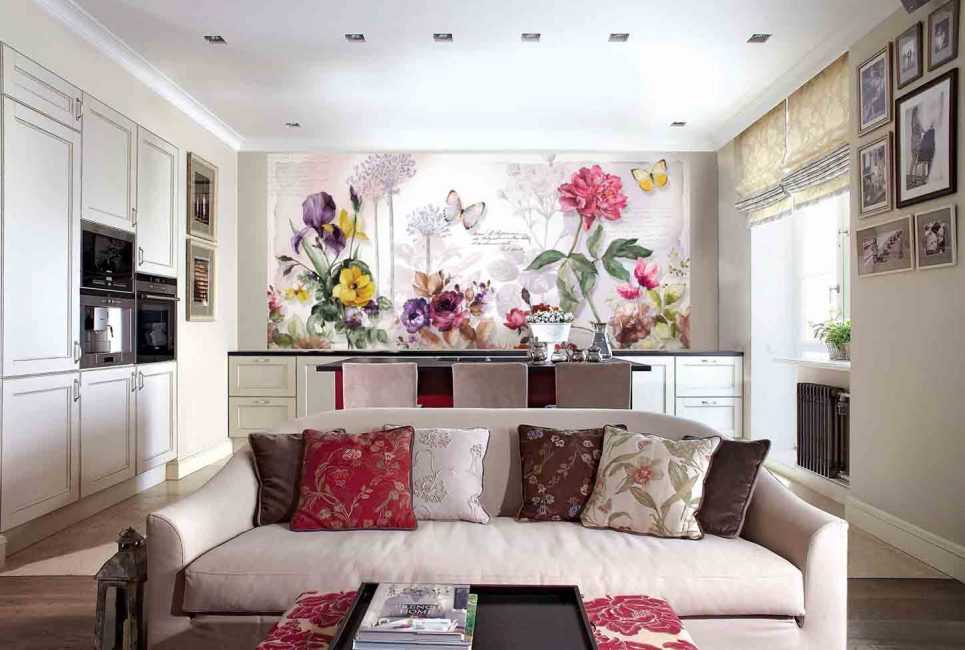 Совмещение кухни с гостиной можно встретить во многих домах и квартирах, часто его применяют для практичности использования двух помещений небольшого размера. При оформлении такой кухни особую роль играет гармоничность, ведь обе комнаты должны быть выполнены в одной цветовой гамме, стиле, иметь целостную задумку. Как же воплотить идею о использовании фотообоев для кухни в такой ситуации?