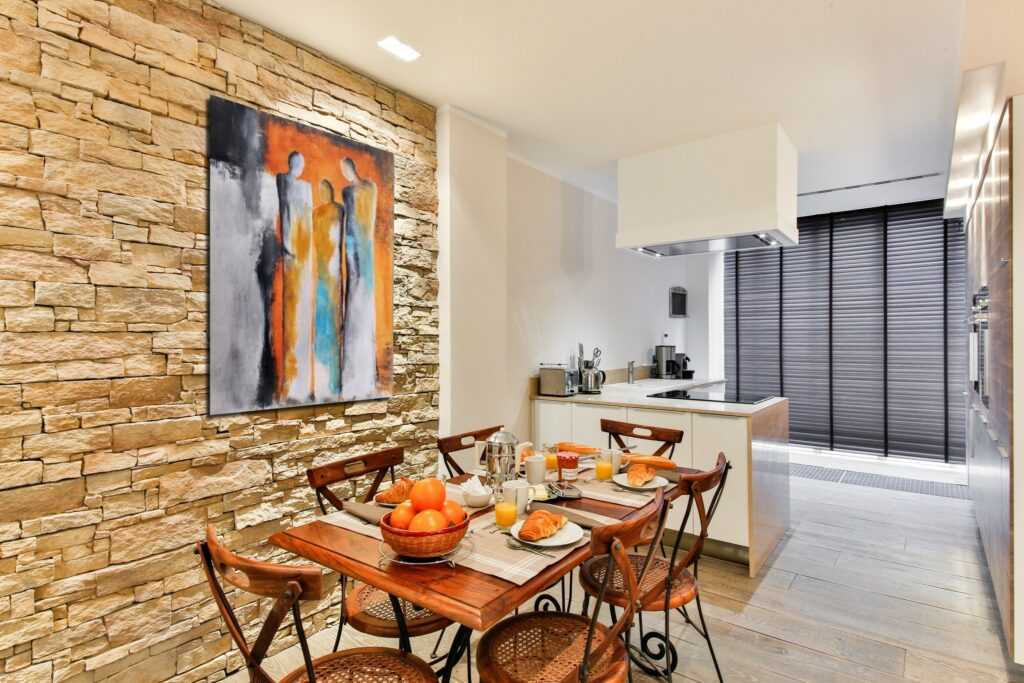 Это материал хрупкий, требующий осторожности в обращении. К тому же такая отделка подразумевает постоянный тщательный уход: даже небольшие загрязнения и отпечатки пальцев на ней бросаются в глаза. Возможно использование зеркального полотна в обеденной зоне, где риск загрязнений и повреждений не так велик