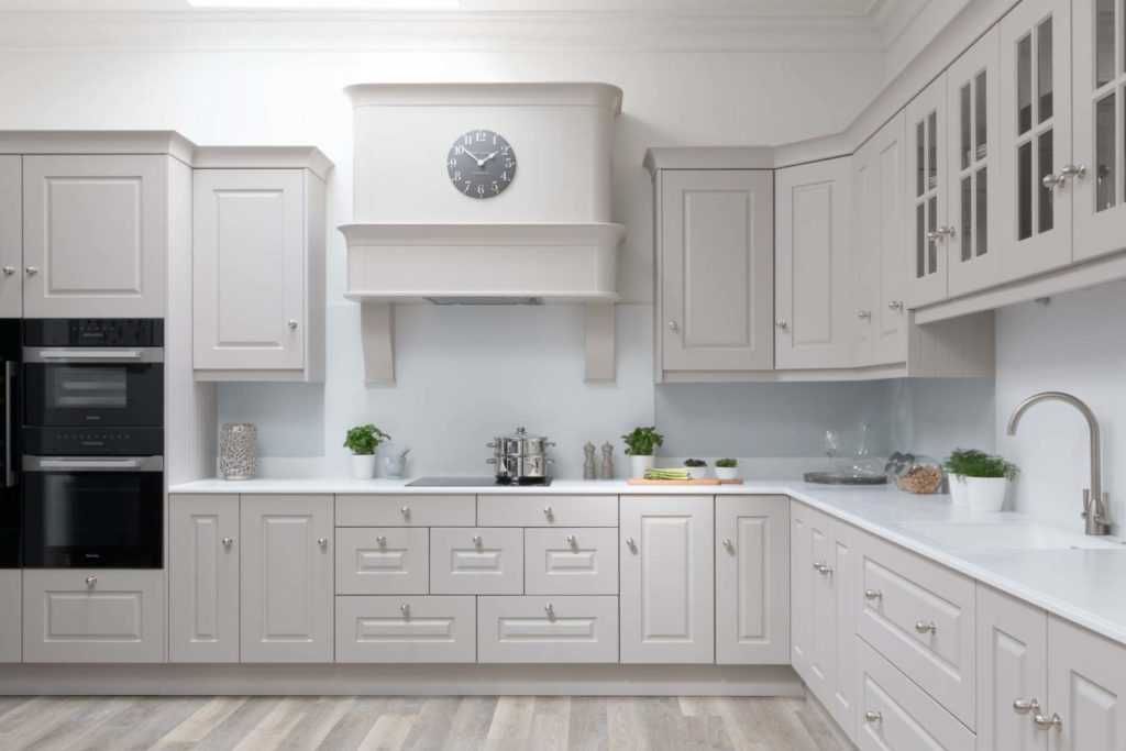 Все формы гарнитура подходят для неоклассики: угловая, п-образная, прямая — без разницы. Но угловую мойку делать не стоит — выглядит как из 90-ых.