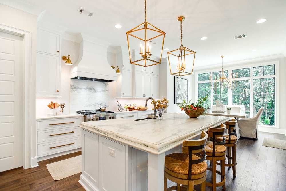 Разбавляют белоснежную обстановку золотыми или бронзовыми элементами (ручки гарнитура, смесители, техника, люстра) и помещение сразу станет интереснее.