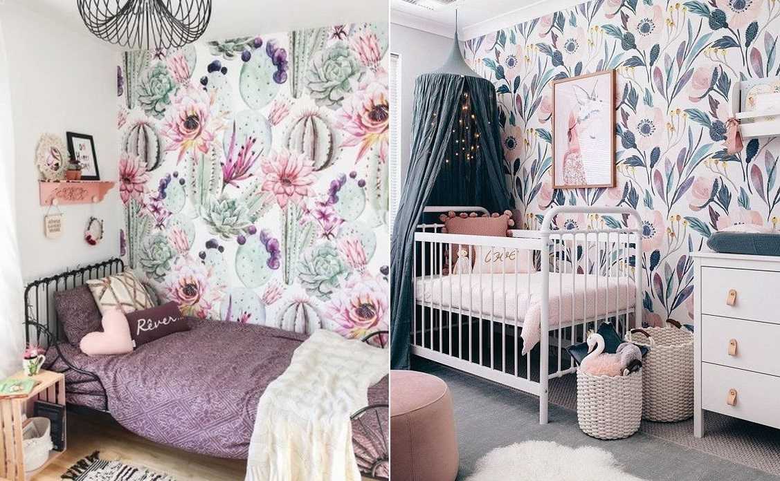 На фото два вида обоев с цветочным и клетчатым принтом.