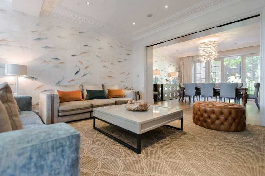 Выбирая узорчатые варианты для зала, учитывайте особенности стилистики интерьера.
