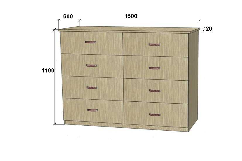 Самые распространенные стандартные размеры комодов: 800х100х450, 800х1200х500, 800х1100х550, 1300х900х500 мм. При этом внутренняя полезная площадь (глубина) будет меньше на 50 мм, поскольку пространство отбирают фасады ящиков (18-20), задняя стенка из ДВП (4), технологические зазоры и припуски плюс мебельная кромка.