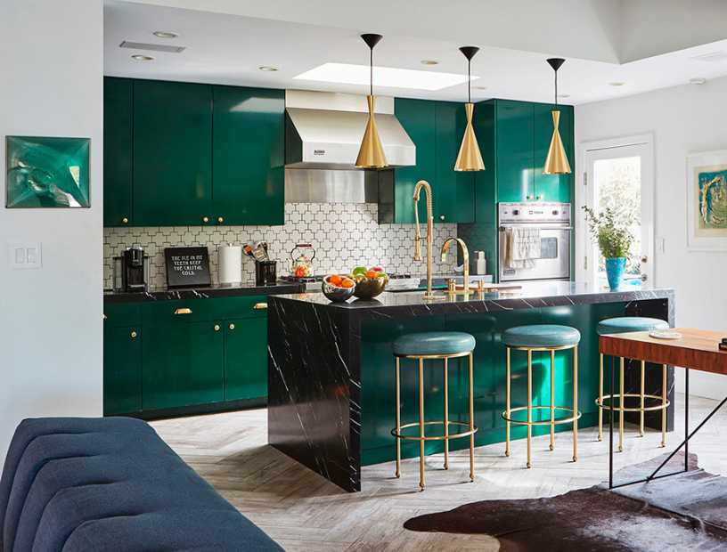 - Один из самых модных цветов, который идеален для современной кухни. Разбавить лаконичную расцветку можно яркими деталями.