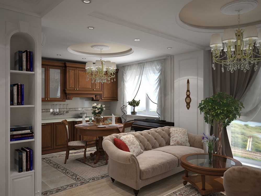 Дизайн кухни-столовой-гостиной в классическом стиле подразумевает свободу пространства. Обязательно большой обеденный стол, изящные кресла и диваны с подушками, пестрые ковры. В комнате должно быть много лепнины, как в гостиной, так и кухонной зоне. Классический стиль подходит семьям, которые соблюдают традиции своих предков и часто собираются вместе.