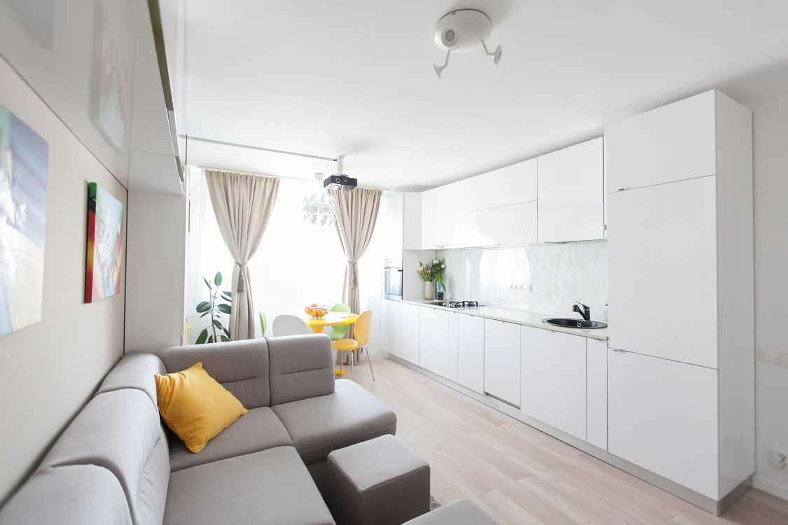 - Для малогабаритных квартир актуально наличие дополнительного спального места в кухне-гостиной. Это касается как места для приема гостей, так и спального места для семьи. Раскладной диван будет практичным решением.