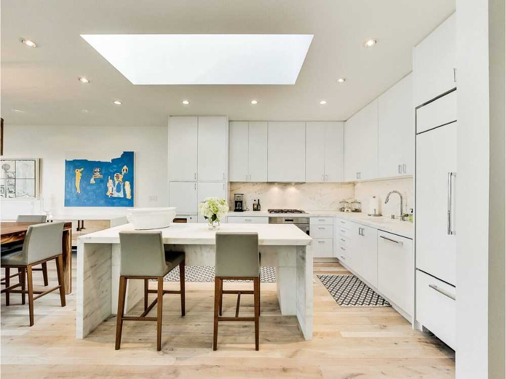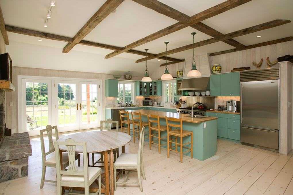 Большая кухня-гостиная позволяет разместить в ней полноценную рабочую зону с внушительным по размеру островом, обладающим разнообразными функциями — от возможности хранить необходимую утварь и использовать это место как большой кухонный стол до удобства мытья посуды по ходу приготовления еды. В комнате также можно расположить столовую. Большое количество окон и светлые тона в отделке позволяют сохранить ощущение простора.