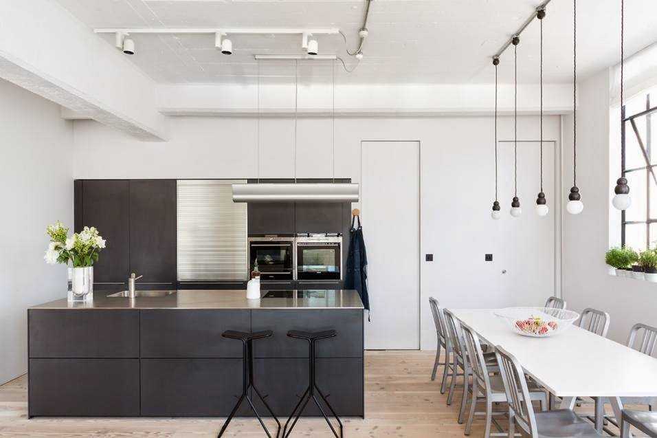 Сорокаметровая кухня-гостиная, оформленная в приглушенных тонах, с мебелью простых форм и мягким освещением, оказывается весьма уютным местом для отдыха и работы. Пространство между комнатой и кухней можно разграничить за счет использования паркета в комнате и другого, более практичного материала для пола в кухне. Граница между двумя зонами подчеркивается с помощью острова и специальной линии освещения.