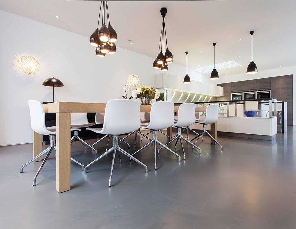Роскошная дизайнерская кухня-гостиная-столовая в частном доме