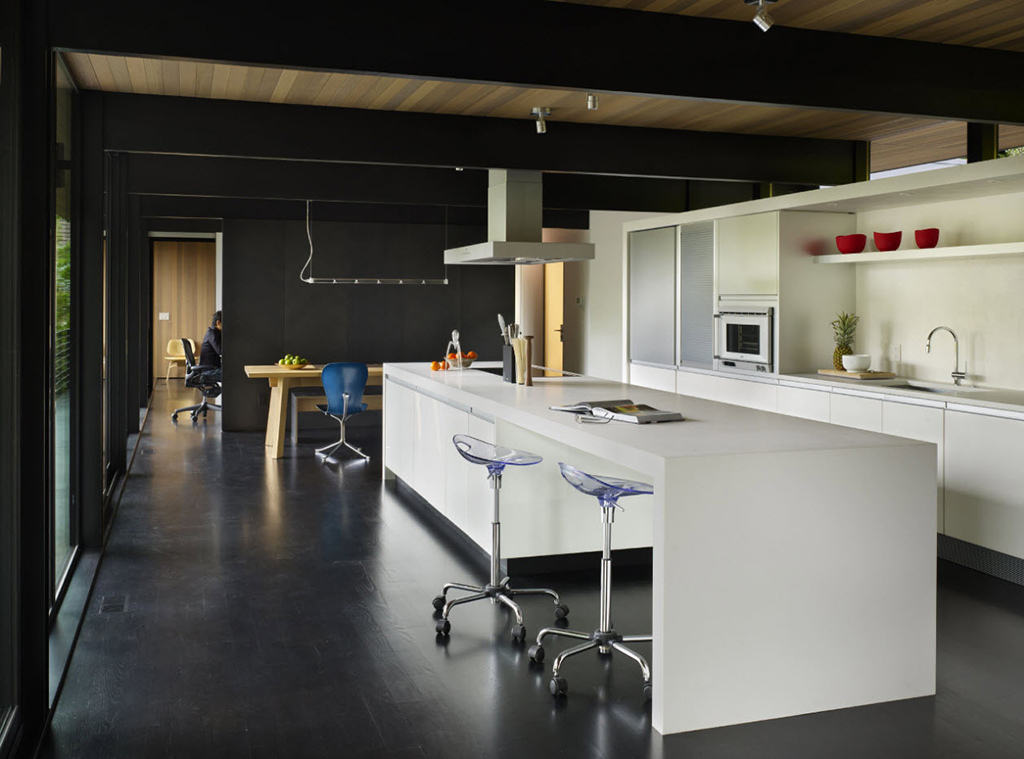 Для того чтобы отделить обеденную зону от рабочих поверхностей, дизайнеры советуют применить прем зонирования.