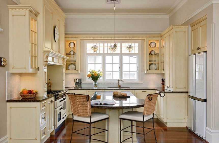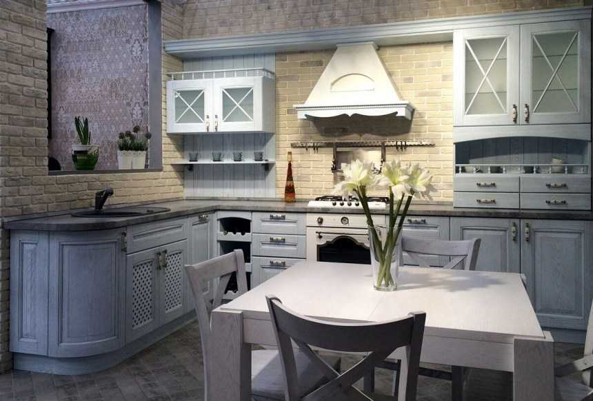 Резные фасады могут быть изготовлены как из натурального дерева, так и из качественного МДФ. Предпочтение отдаётся белому цвету, однако бирюзовая кухня или цвета лаванды будет весьма эффектно смотреться на фоне разбеленных стен и потолка. Планируя кухню, стоит учитывать и предметы мебели в гостиной – витрины можно продублировать в декоративном шкафу для книг, а яркий цвет фасадов добавить в текстильные элементы – подушки или пледы.