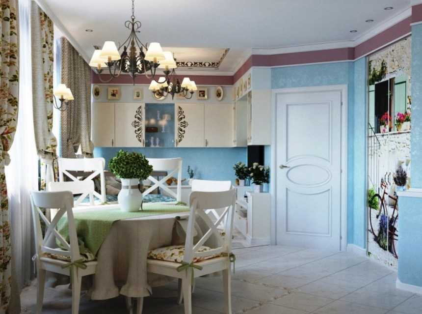 Объединение в одном помещении функций трех комнат — кухни, столовой и гостиной, может стать выгодным решением, повышающим комфорт жизни. Успешная реализация плана во многом зависит от конфигурации и объема помещения. Например, в комнате L-образной формы зонирование происходит естественным образом. Главным вопросом для организации кухни гостиной прованс становится грамотное выделение места под каждую зону. Для деления используют несколько приемов: