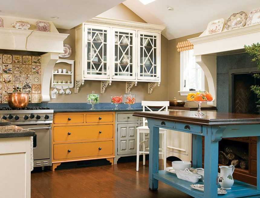 Фасады с филенками, вставки из стекла, резьба по дереву — всё это очень хорошо придаёт кантри стилистику практически любому гарнитуру.