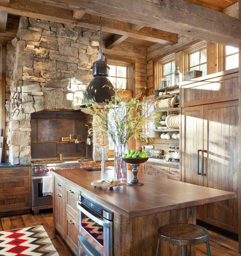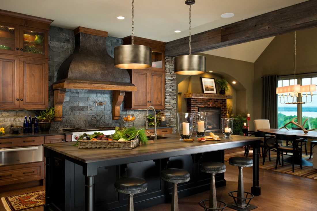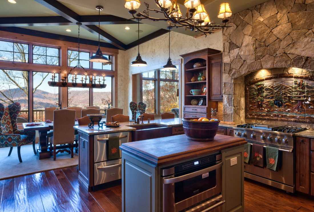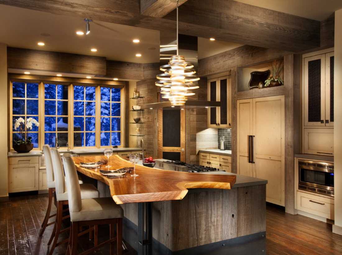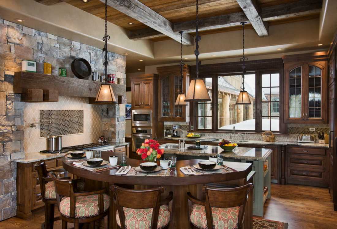 Кухня в стиле шале в загородном доме дает вам больше возможностей в применении различных материалов, чем дизайн кухни в квартире в этом стиле. Главное при отделке помещения – необходимо использовать качественное натуральное дерево и камень или материалы, стилизованные как натуральные.