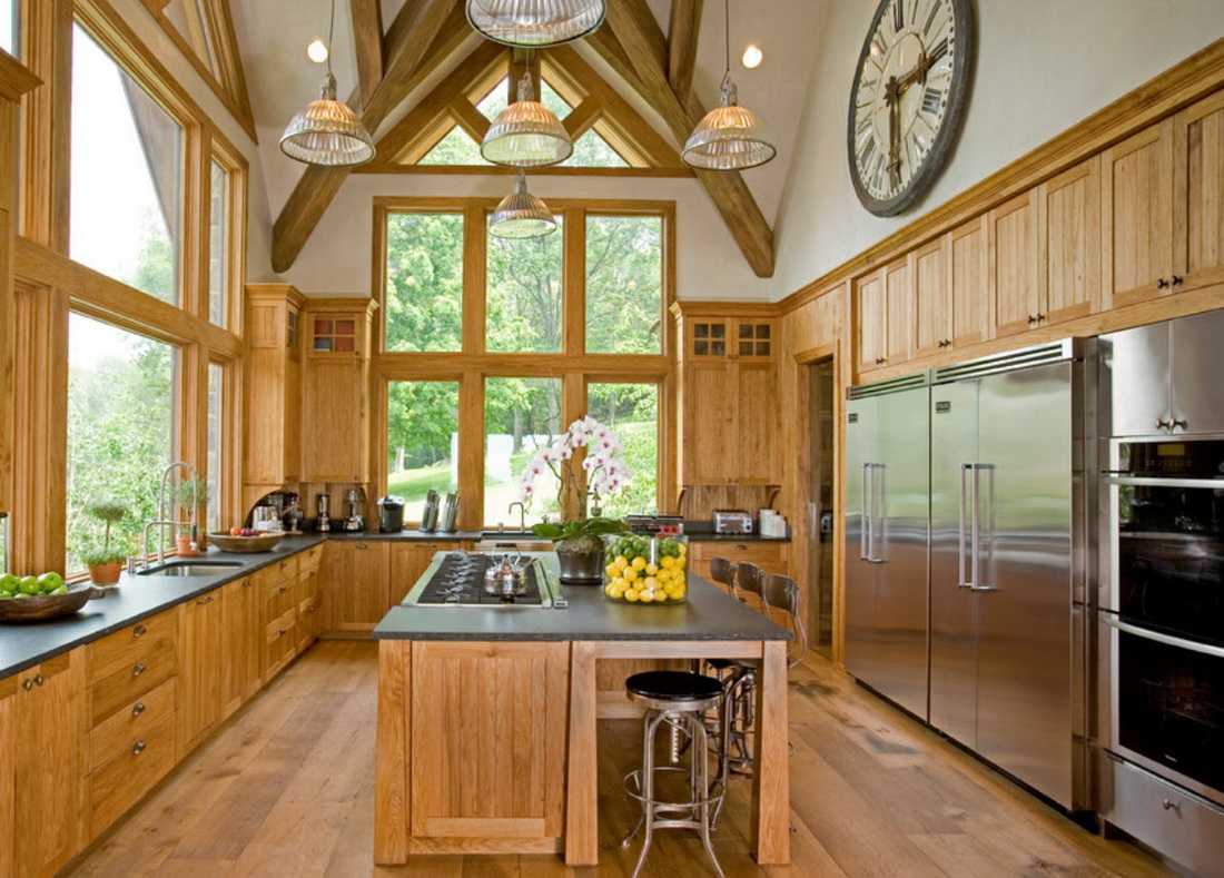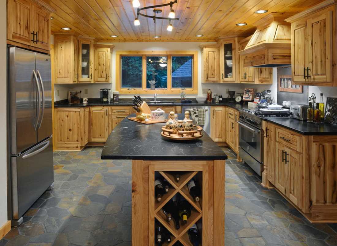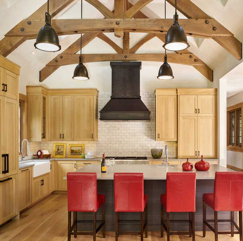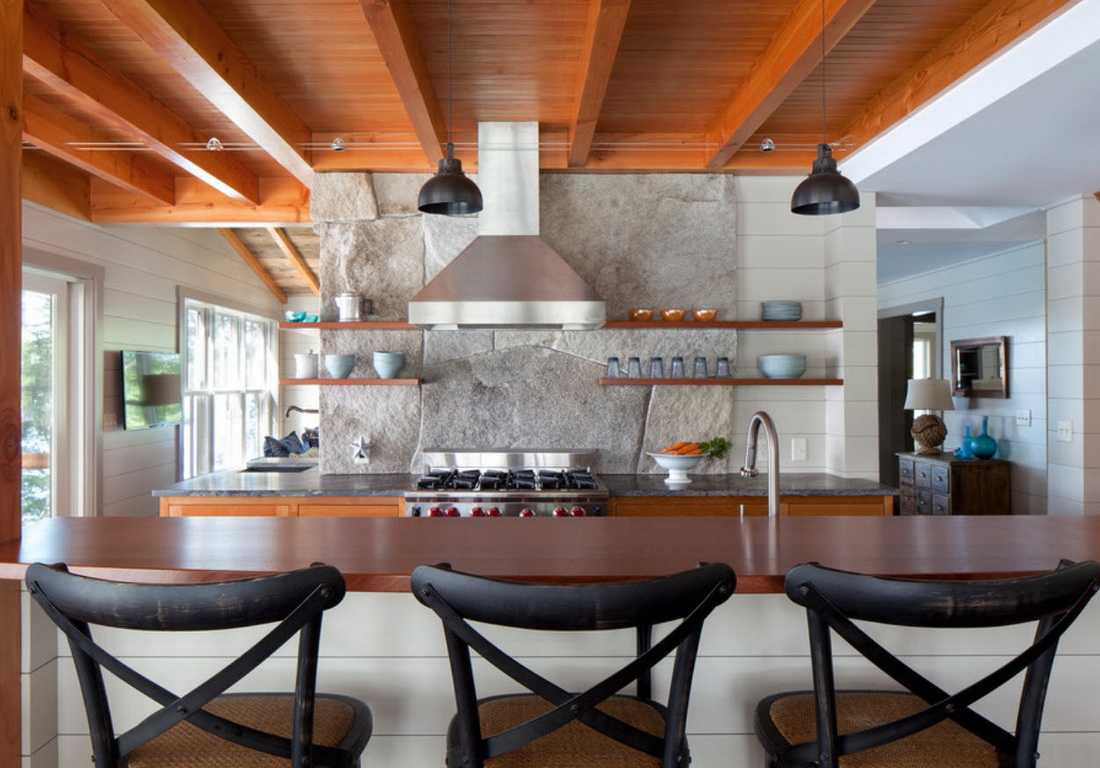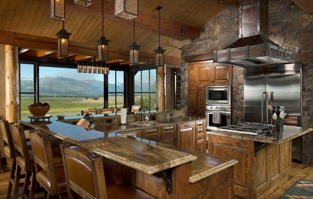 Кухня в стиле шале в загородном доме дает вам больше возможностей в применении различных материалов, чем дизайн кухни в квартире в этом стиле. Главное при отделке помещения – необходимо использовать качественное натуральное дерево и камень или материалы, стилизованные как натуральные.