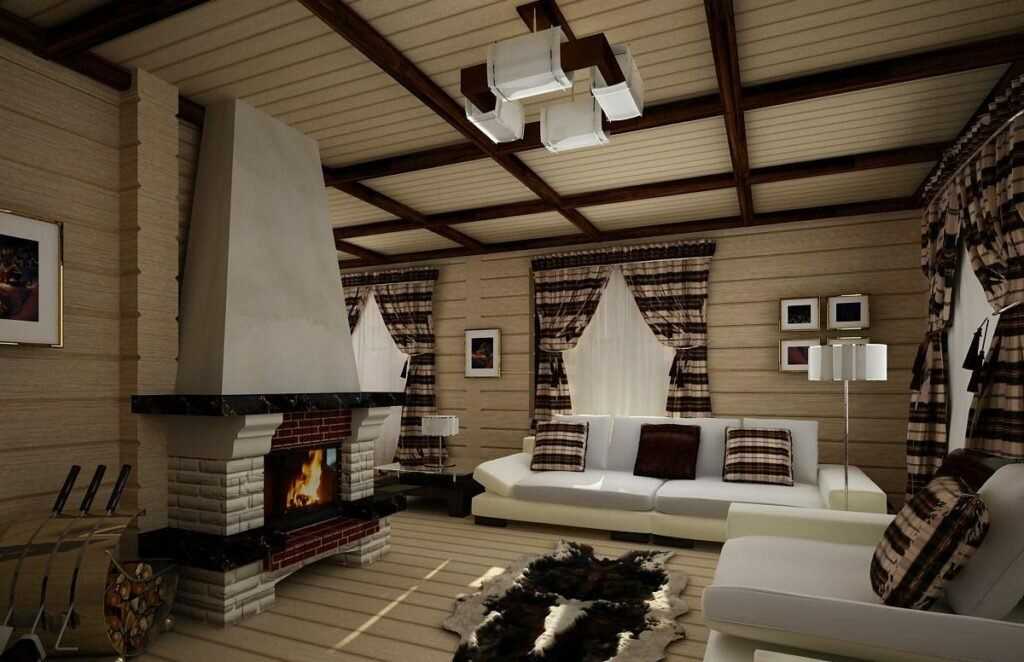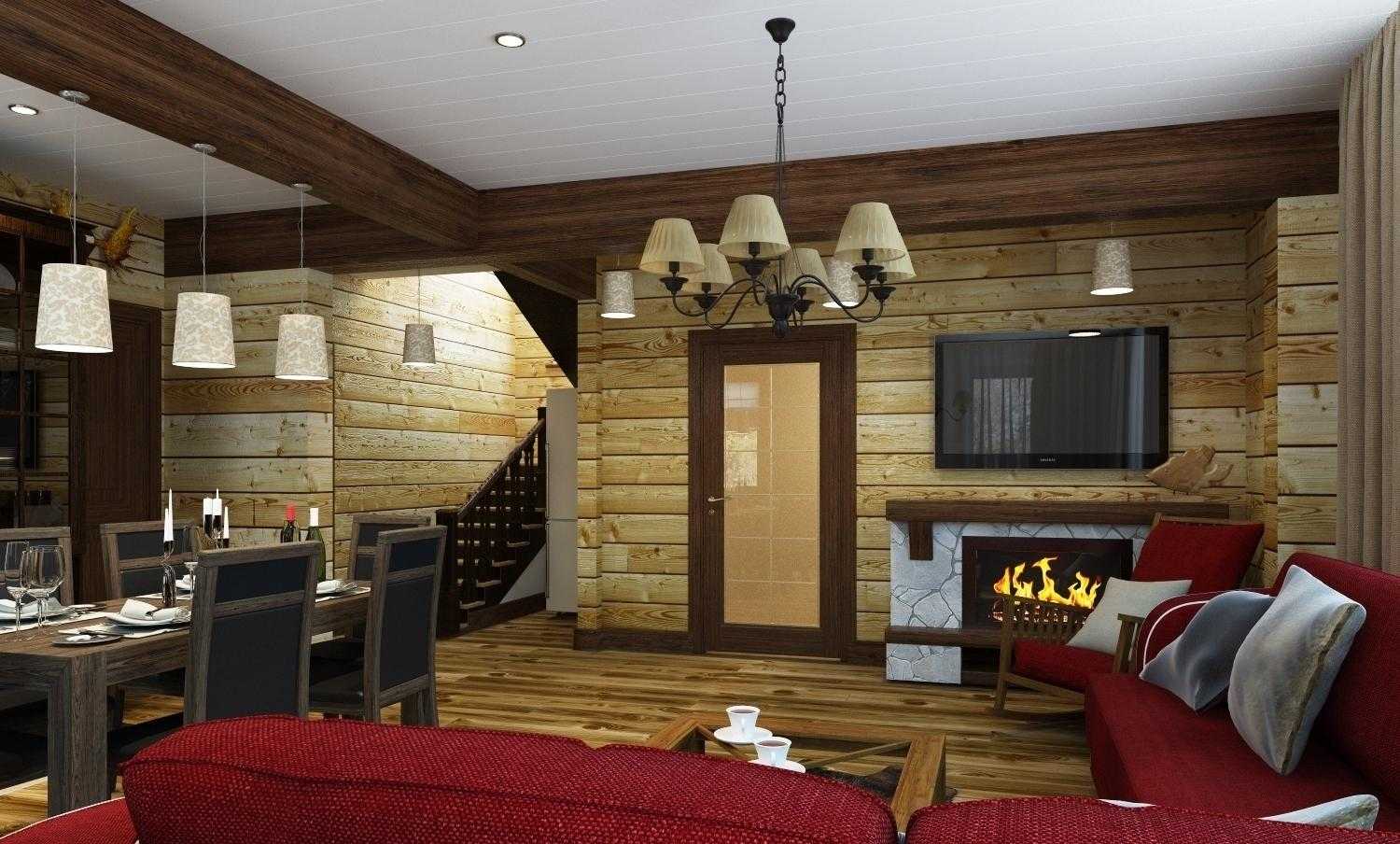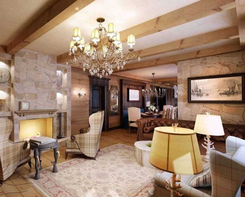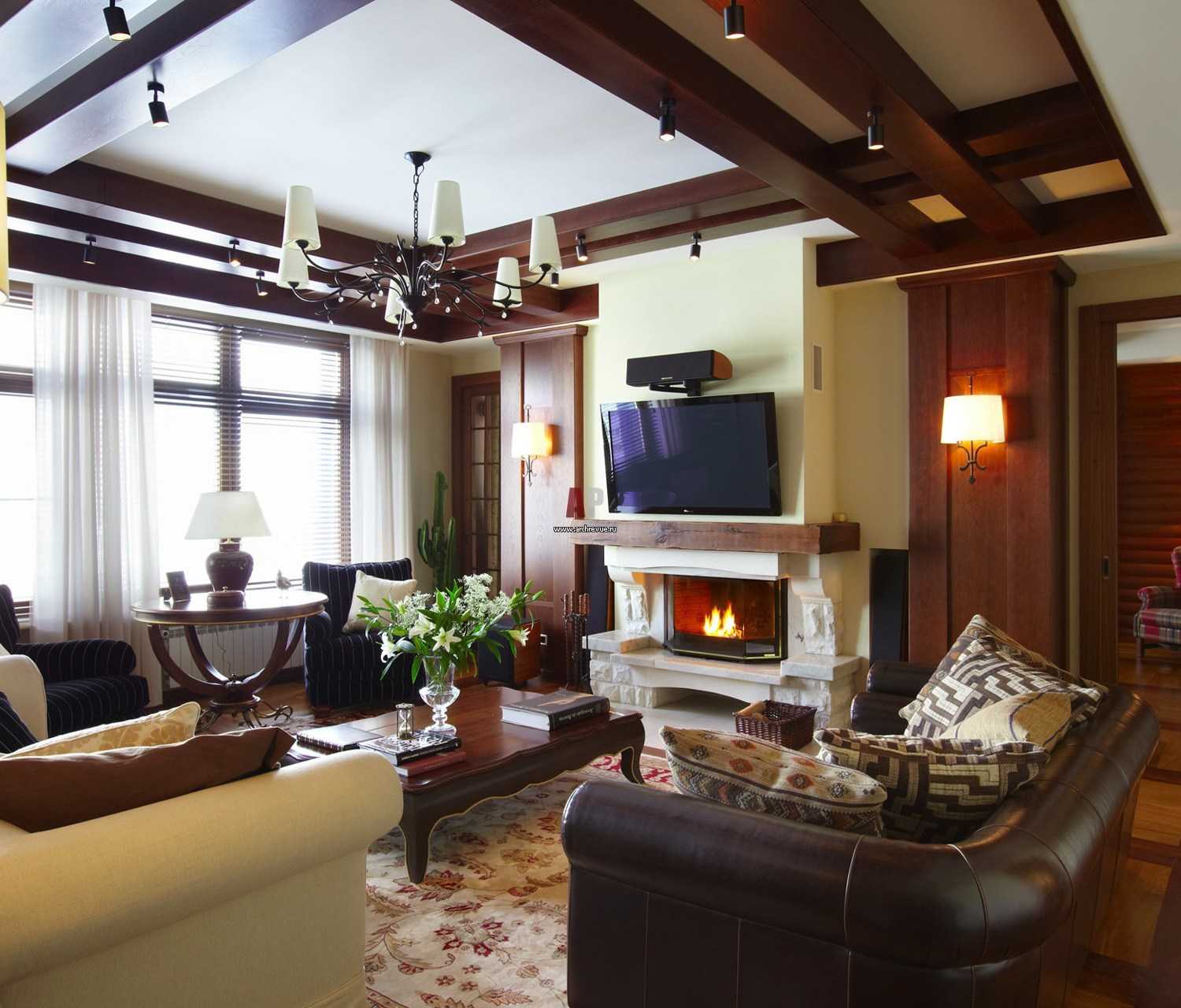 Если гостиная совмещена с кухонным пространством, тогда обеденная зона обычно обустраивается в виде небольшого стола недалеко от кухни или же таковую заменяет барная стойка, которая может быть довольно оригинальной в деревянном исполнении. Зону отдыха выполняют обычным образом: здесь стоит диван, возможно, даже два кресла и журнальных столик. Напротив располагается телевизор или камин. При грамотном возведении очага телевизор с камином могут находиться на одной стене.
