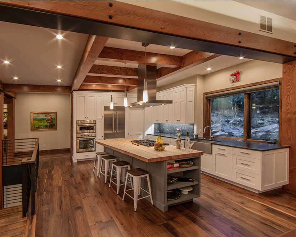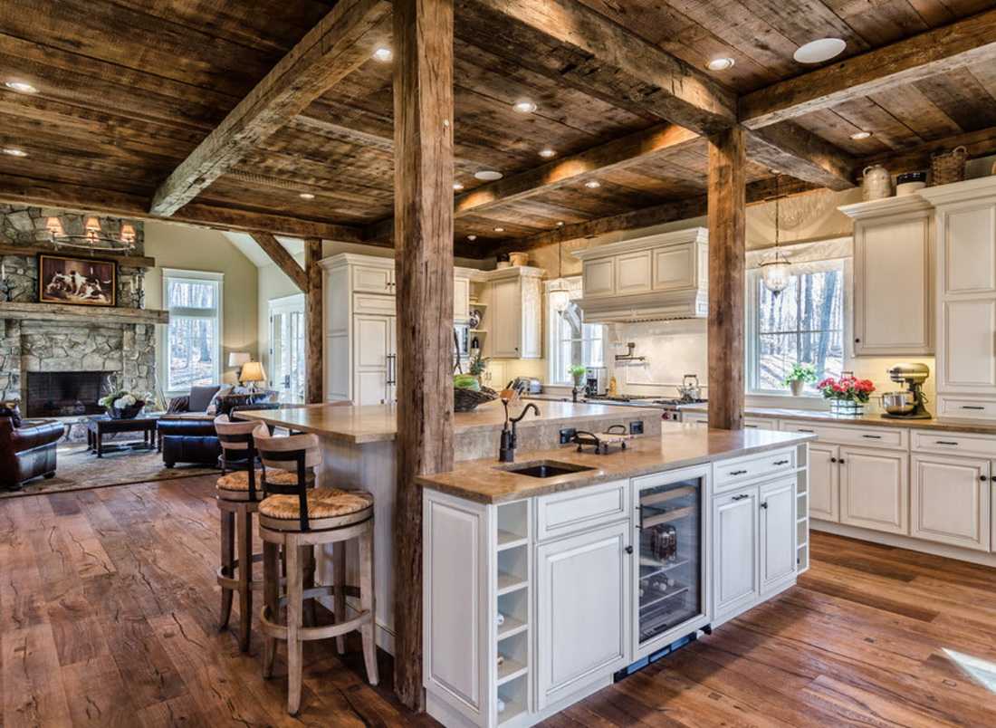 Потолок на кухне в стиле шале только деревянный. Крупные балки придают ему величавость и объём. Светло-серые оттенки добавляют пространства и воздуха.