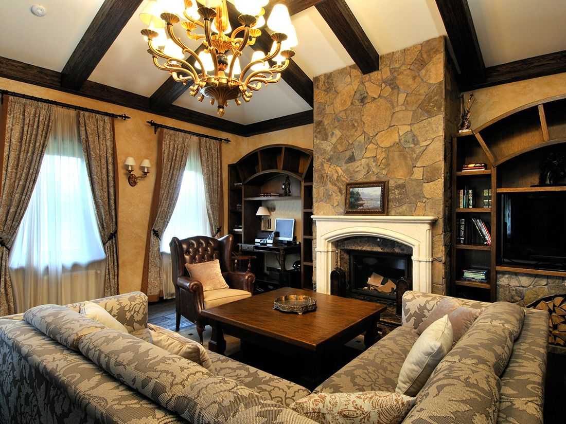 Они могут быть и ручной работы, вышитые. Главный критерий при выборе тканей — полная натуральность материала. Оконные занавески или шторки тоже обязательно должны быть только из натуральных тканей. Никакой синтетики: только кашемир, лен, хлопок, шерсть. Подчеркнуть индивидуальность стиля можно натуральными меховыми шкурами животных, которые можно постелить на пол или повесить на стену. Можно покрыть диван классическим пледом в клеточку или каким-нибудь грубым пледом, на стенах развесить охотничьи трофеи. Неплохо будут смотреться на полу всевозможные вязаные шерстяные дорожки или ковры. Не помешают на стенах старые фотографии и картины в деревянных рамках. Отличным дополнением будут фетровые подушки на стульях, вышитые крестиком.