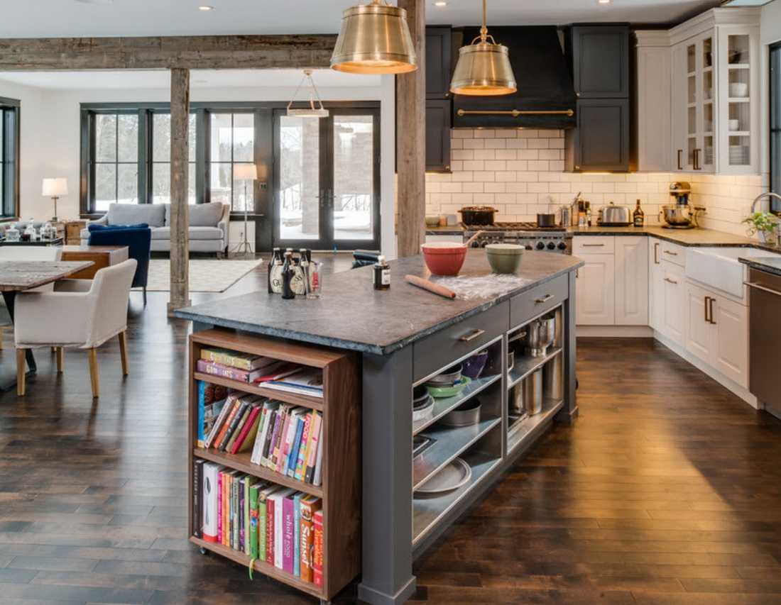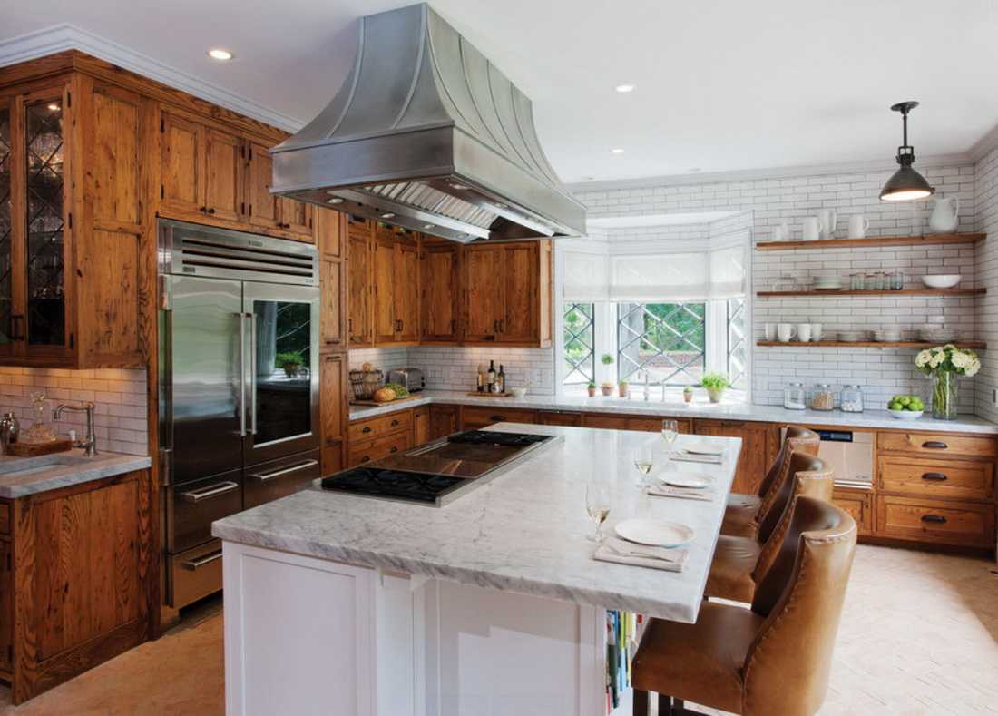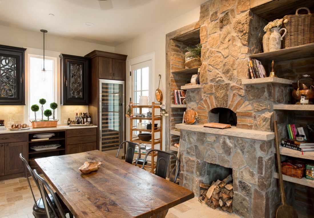 Наличие камина в интерьере — это главный атрибут данного стиля. Камин служит центральной деталью создания уютной атмосферы. Но обычно это компонент гостиной комнаты, поэтому в интерьере кухни обходятся без него. Но вытяжка над плитой, которая может быть задекорирована под кирпичную кладку, может являться неплохим напоминанием присутствия камина.