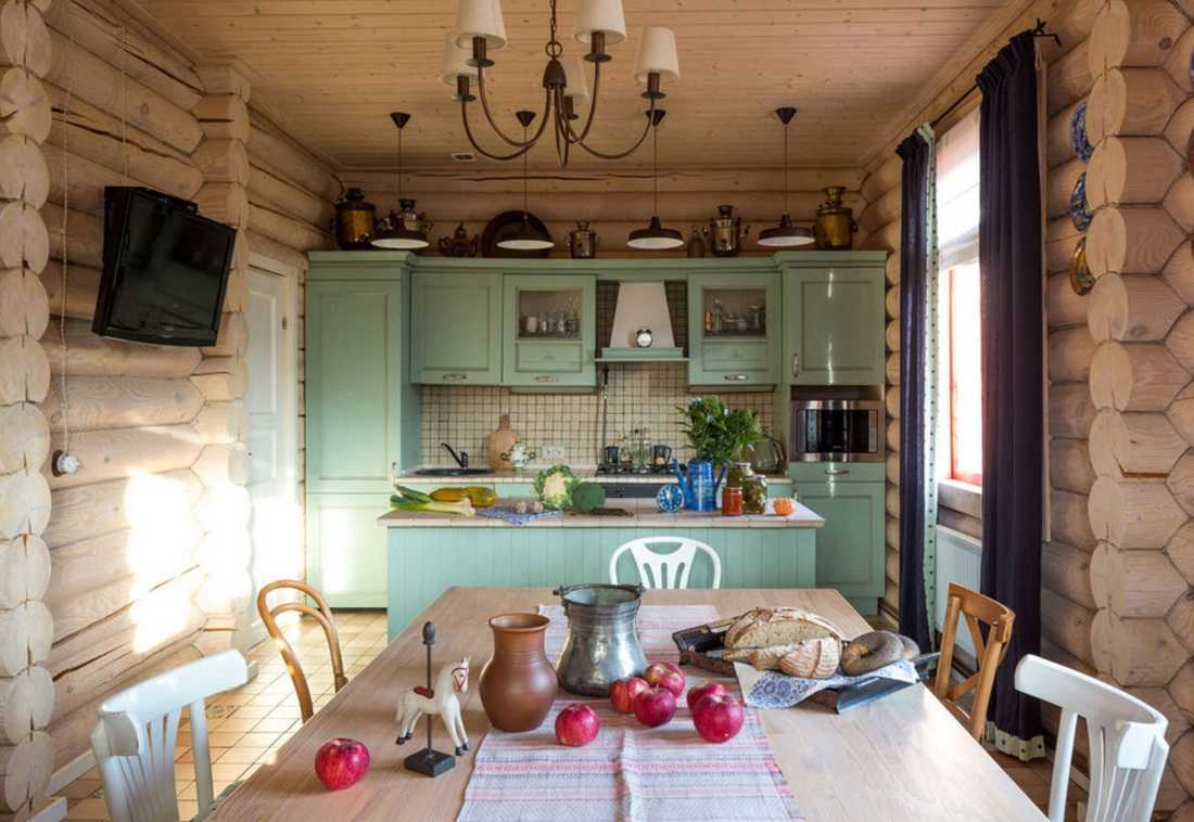 Кухня в стиле шале оформлена в нежно-оливковом цвете. Интересное цветовое решение для деревенского стиля.
