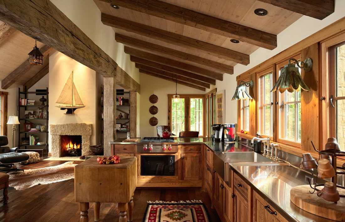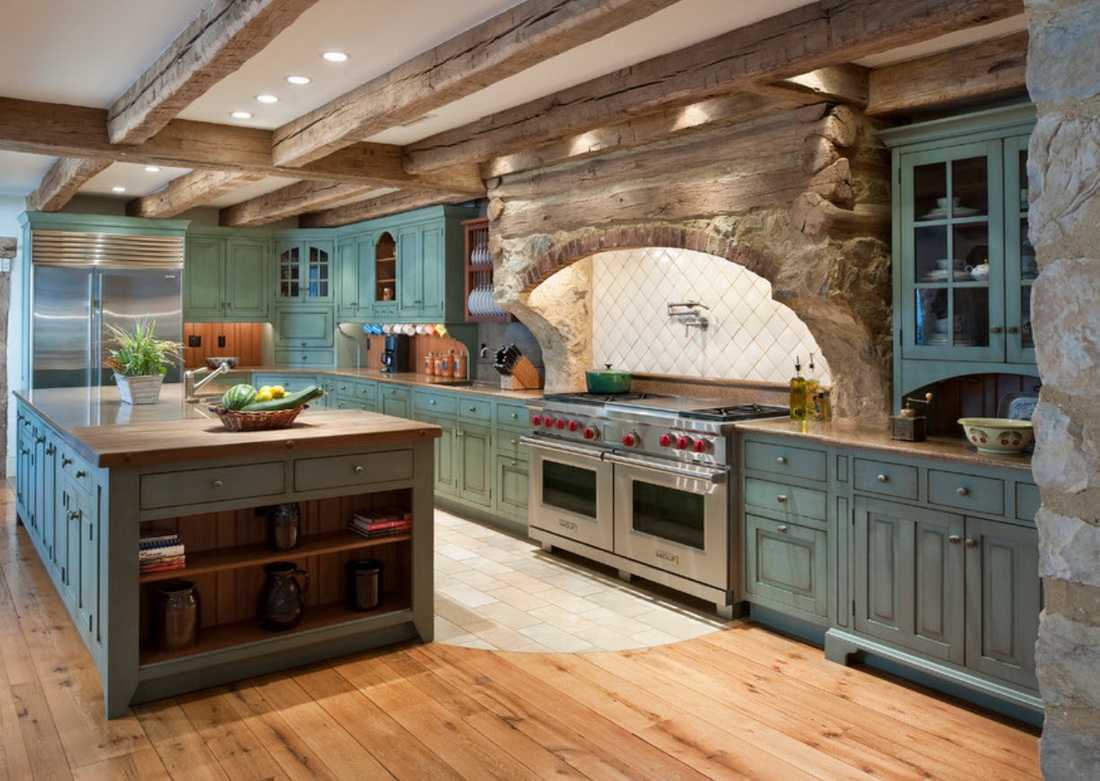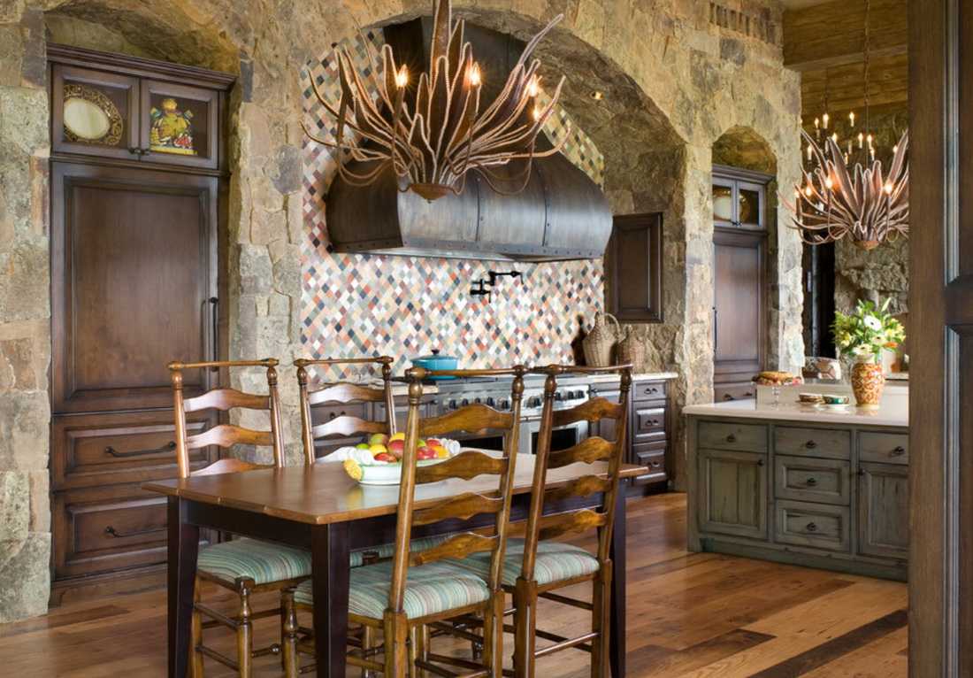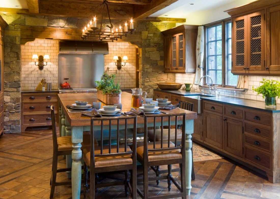 Главным элементом в интерьере кухни являются различные балки на потолке. Балки должны быть темного цвета, невыбеленные, грубо обработанные, чтобы намеренно «старить» древесину. Для напольного покрытия используется доска, покрытая лаком. При отделке стен дизайнеры советуют отдать предпочтение распиленному пополам бревну или деревянным панелям. Но это необязательно. Можно и просто покрыть штукатуркой бежевого, серо-бежевого или серого цвета. Стены можно отделать плиткой под камень. Так как весь интерьер выполняется в темных, серых и невзрачных оттенках, его можно разбавить глиняной посудой с ярким орнаментом (тарелками, вазочками, статуэтками), а также старинными кружевными шторками на шкафчиках. Люстра на потолок выбирается кованая, с деревянными элементами. Отлично подойдет люстра из чугуна или бронзы.