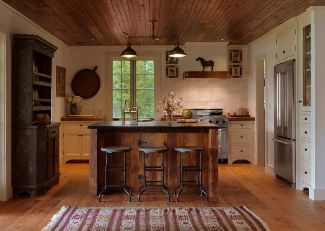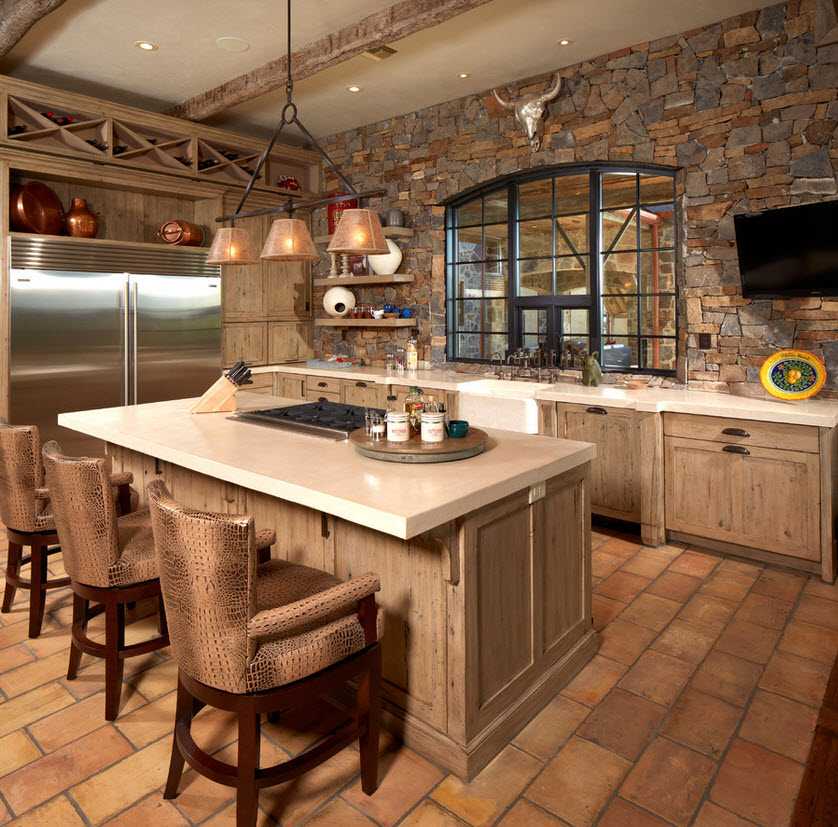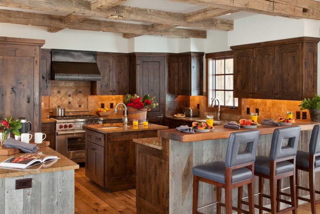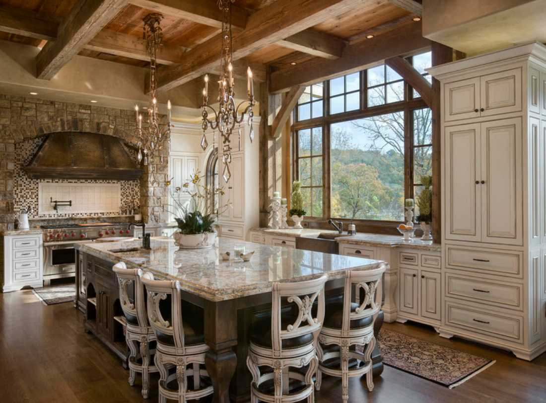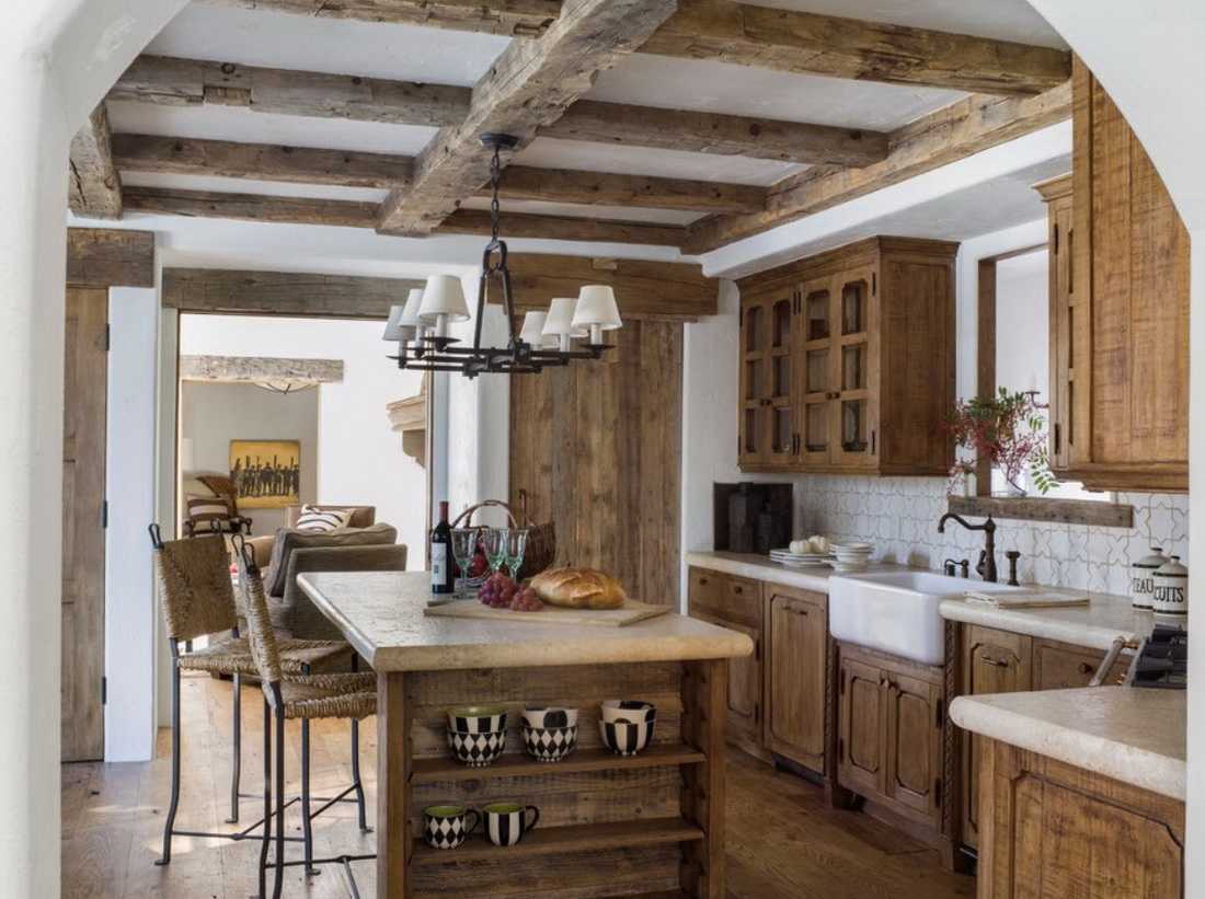 Главным элементом в интерьере кухни являются различные балки на потолке. Балки должны быть темного цвета, невыбеленные, грубо обработанные, чтобы намеренно «старить» древесину. Для напольного покрытия используется доска, покрытая лаком. При отделке стен дизайнеры советуют отдать предпочтение распиленному пополам бревну или деревянным панелям. Но это необязательно. Можно и просто покрыть штукатуркой бежевого, серо-бежевого или серого цвета. Стены можно отделать плиткой под камень. Так как весь интерьер выполняется в темных, серых и невзрачных оттенках, его можно разбавить глиняной посудой с ярким орнаментом (тарелками, вазочками, статуэтками), а также старинными кружевными шторками на шкафчиках. Люстра на потолок выбирается кованая, с деревянными элементами. Отлично подойдет люстра из чугуна или бронзы.