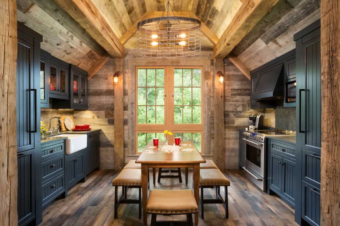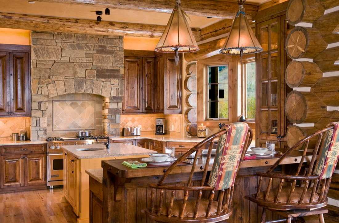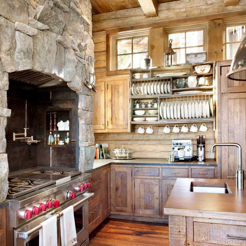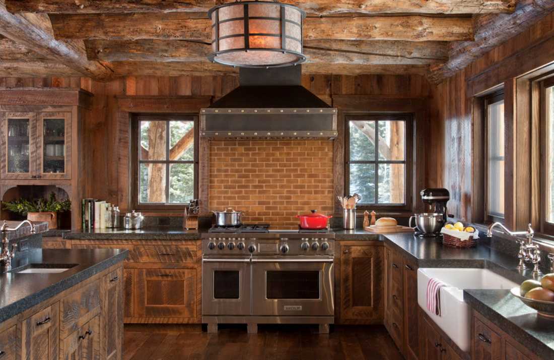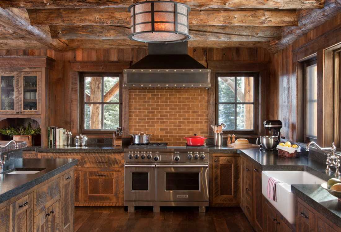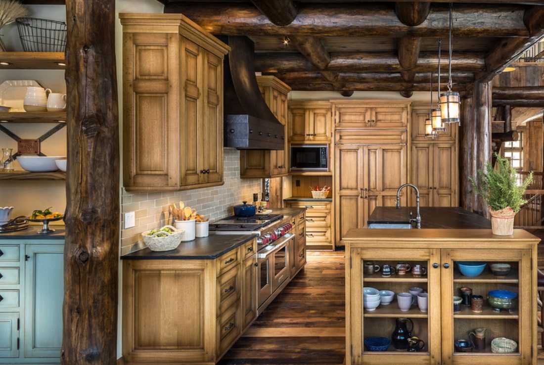 Креативный дизайн гарнитура в стиле шале подходит для организации кухни в охотничьем домике.