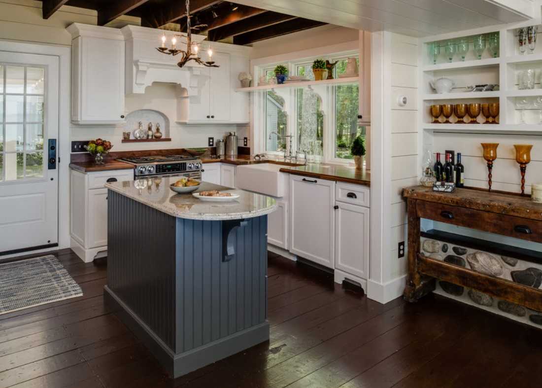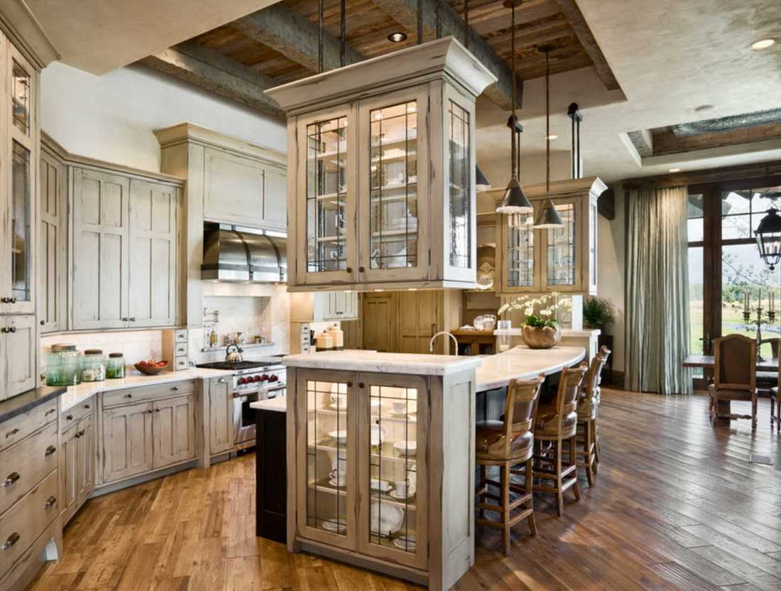 Кухня в стиле кантри манит своим деревенским шиком. Множество навесных шкафов со стеклянными дверцами позволяют сэкономить полезное кухонное пространство.