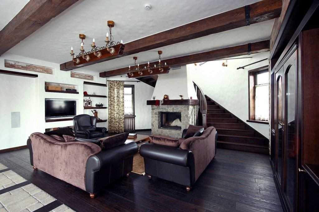 Полок оформляют в общем стиле стен под штукатурку или побелку, главное при дизайне – это наличие потолочных балок из темного дерева в одном цвете с половой доской.