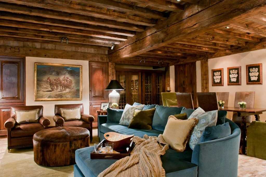 Мебель не обязательно должна быть одного стиля, но обязательно основная часть сделана из массива натурального дерева. Она незамысловата по дизайну и даже грубовата. Шале – враг роскоши. Если в кухне стоит кожаный диван, то он напоминает диваны из охотничьих домиков, потёрт и обит грубой кожей.