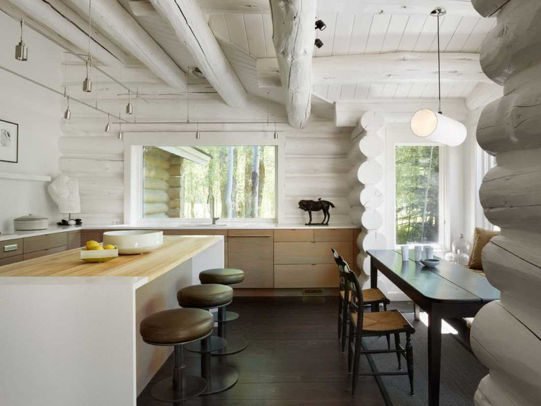 В современных кухонных интерьерах, декорированных в стиле шале, можно встретить меблировку из натурального сырья в нежной гамме, но с аскетичным дизайном. Это означает, что мебель не обязательно должна быть грубой и темной.