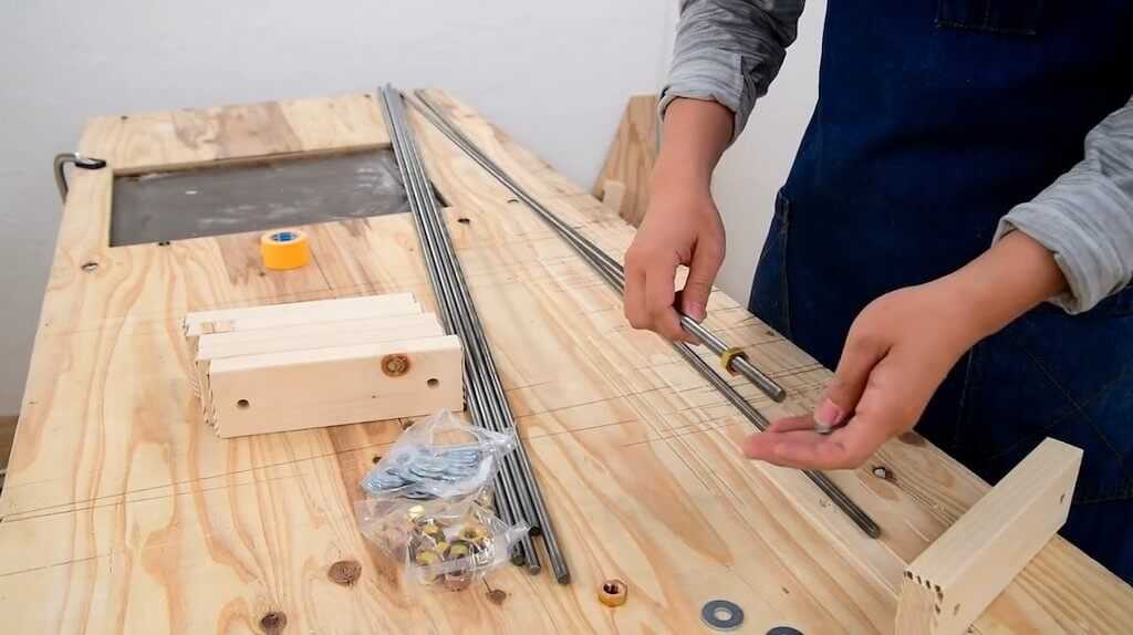 Сверлить дырки нужно аккуратно, не спеша, чтоб не испортить опоры. Конструкция скрепляется самонарезающими шурупами, которые вкручиваются через бруски, деревянные подставки. Для скрепления упор используют длинные перемычки.