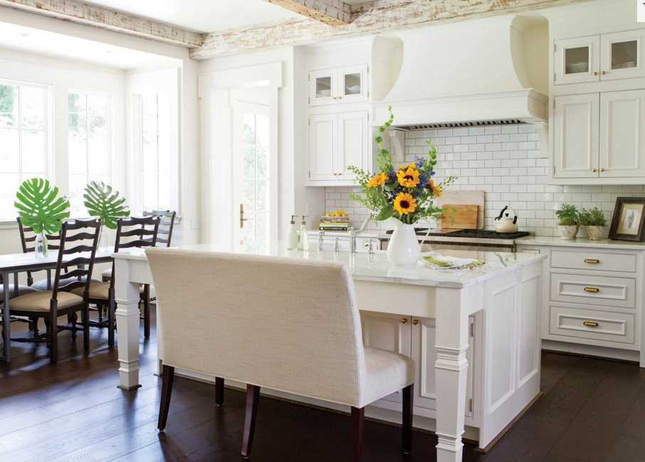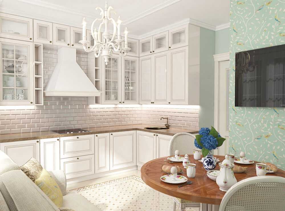 В таком варианте раковина тоже будет в белом цвете, а фигурный смеситель под старину только дополнит создаваемый интерьер. Среди функциональных приборов на кухне, стилизованных под прованс, выступит вытяжка над плитой, имитирующая каминную трубу. А обеденная зона с угловыми лавками, плетеным декором и цветами на круглом столе станут завершающим штрихом в общей концепции. Кирпичная кладка на стенах в данном случае поможет зонировать пространство.