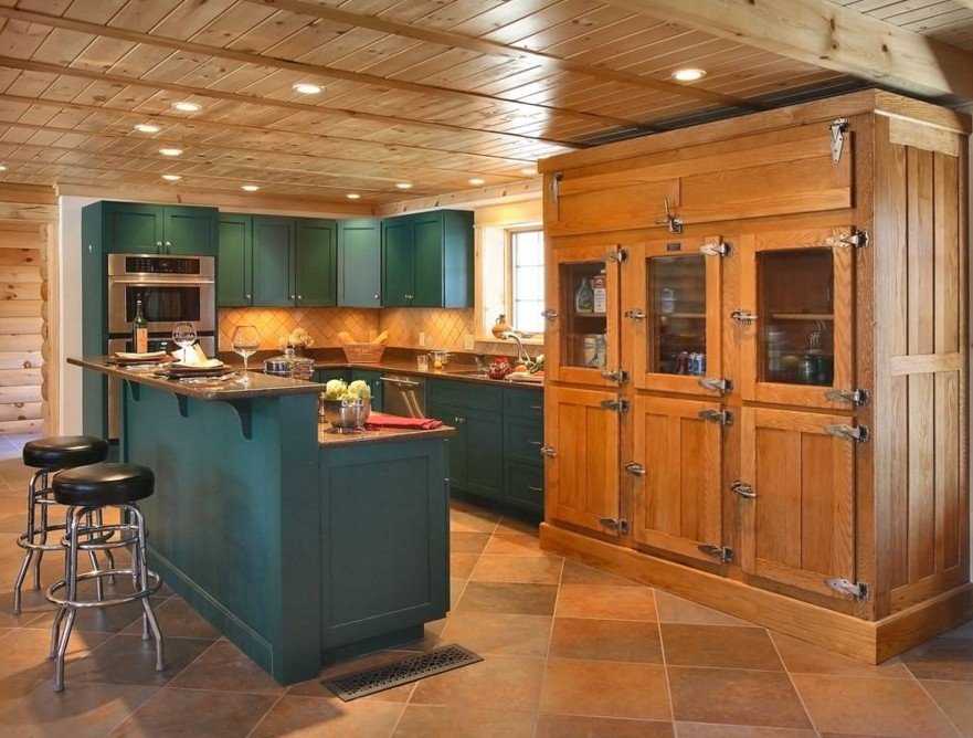 Для отделки стен и пола на кухне выбирают исключительно натуральные материалы с природной фактурой. Это может быть кирпичная кладка, обшитая деревом панель, выкрашенная стана и побеленный потолок.