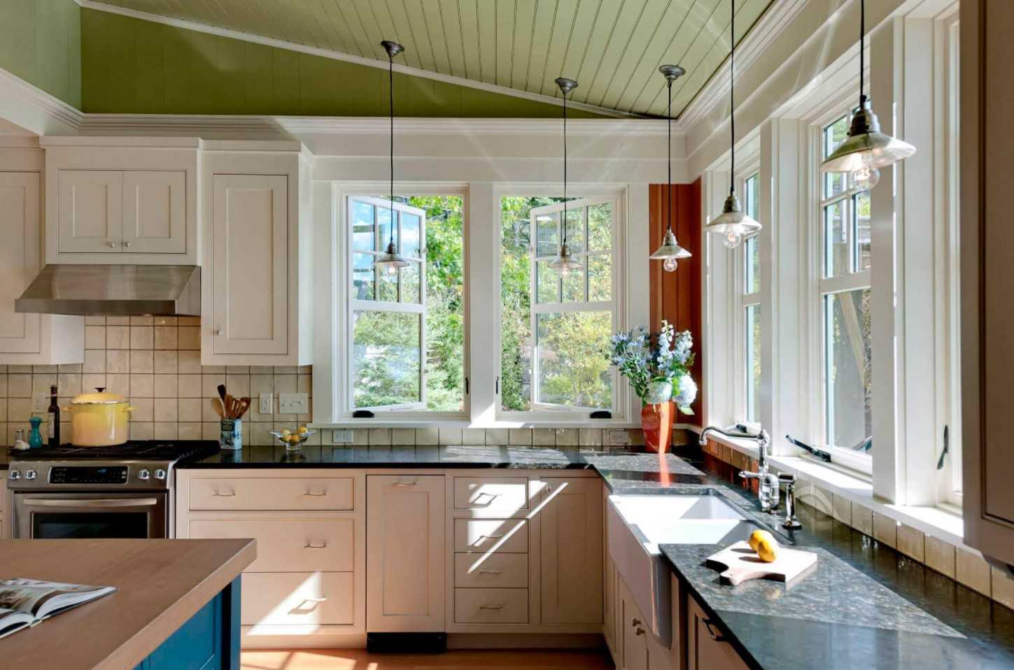 Место под окнами можно задействовать под рабочую поверхность, демонтировав подоконник, или расположить мойку напротив окна.