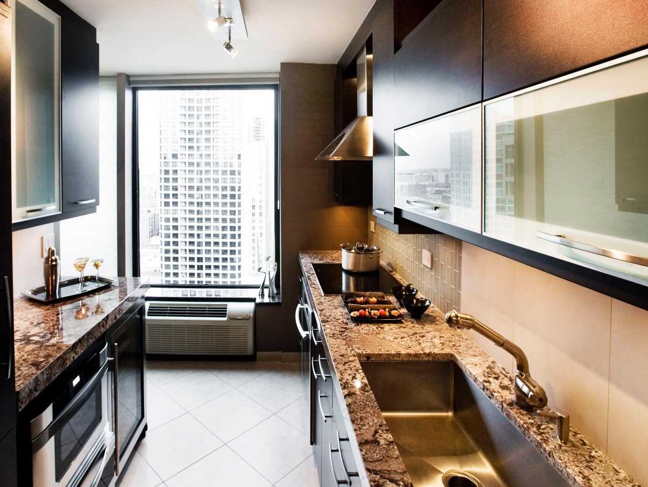Для этого ограничьте количество деталей и мебели в помещении. По возможности используйте встроенную технику, а гарнитур размещайте линейно либо буквой П, где перпендикулярная двум параллелям линия останется за мойкой с видом на окно.